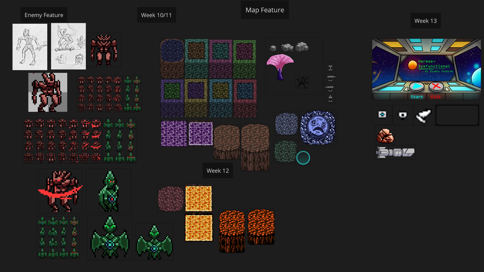 My role was to create sprite work, concept art, the main menu, and the end screen. I made all of the sprite work, excluding the UI.